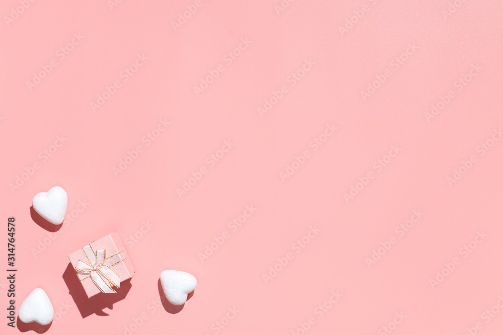 Pink gift box and white decorative hearts on pink background. Flat lay composition. Romantic, St Valentines Day concept