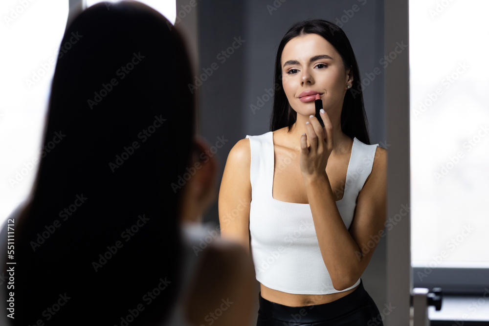 Cosmetic products on marble texture. Lipsticks, nail varnish, makeup brushes on white marble background. High angle view