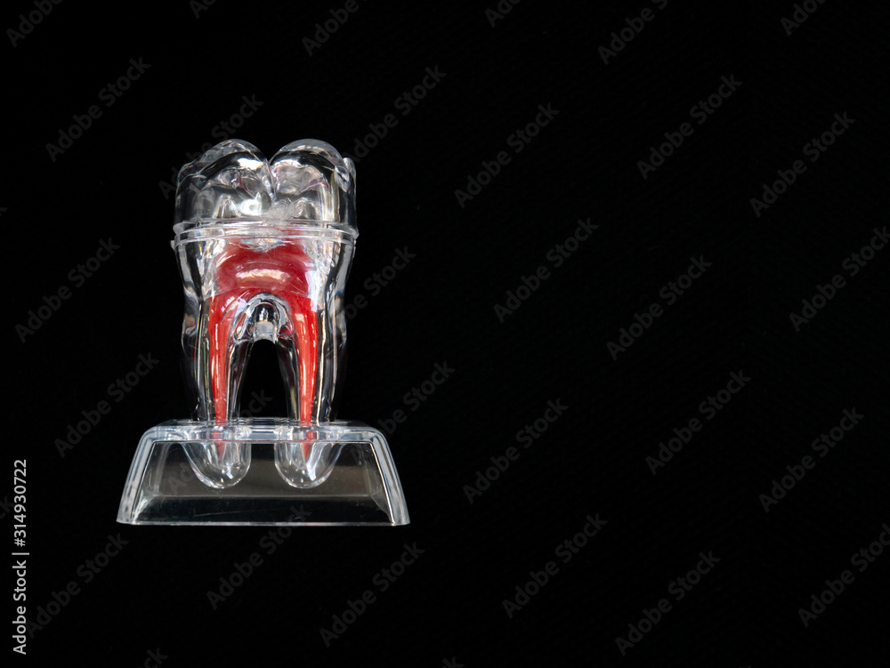 Crystal clear and transparent implant of dental tooth figure with red root object for dentist explain about clean and oral gum care on isolated black background with right copy space