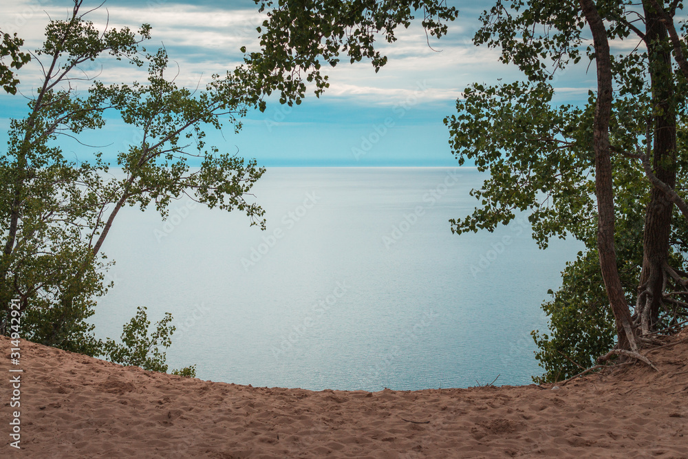 Framed shot of Lake Michigan from the Sleeping bear dunes through the trees
