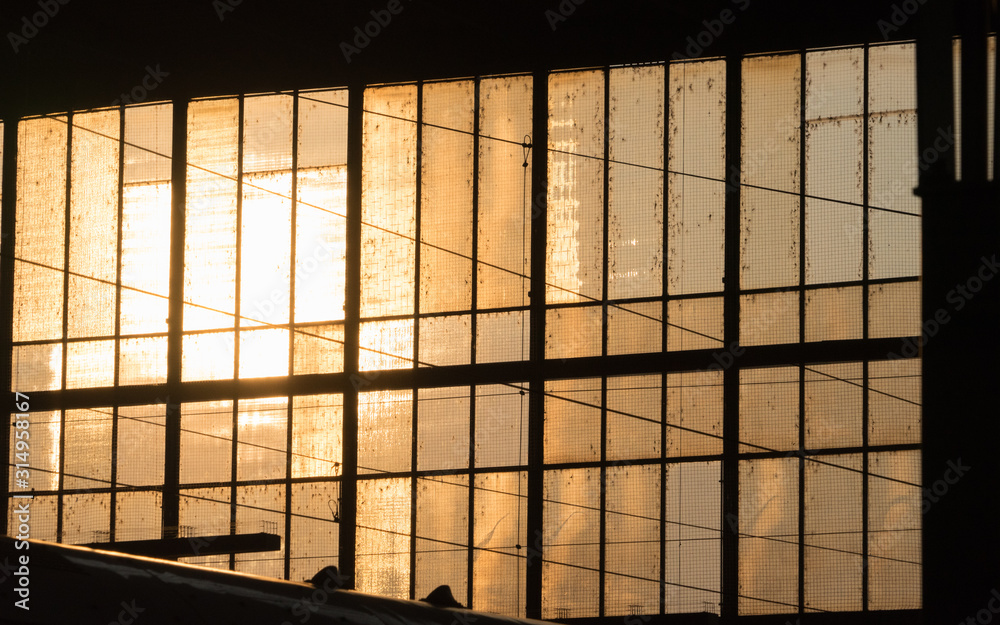 Industriehalle - gelb hinterleuchtete Sprossenfenster