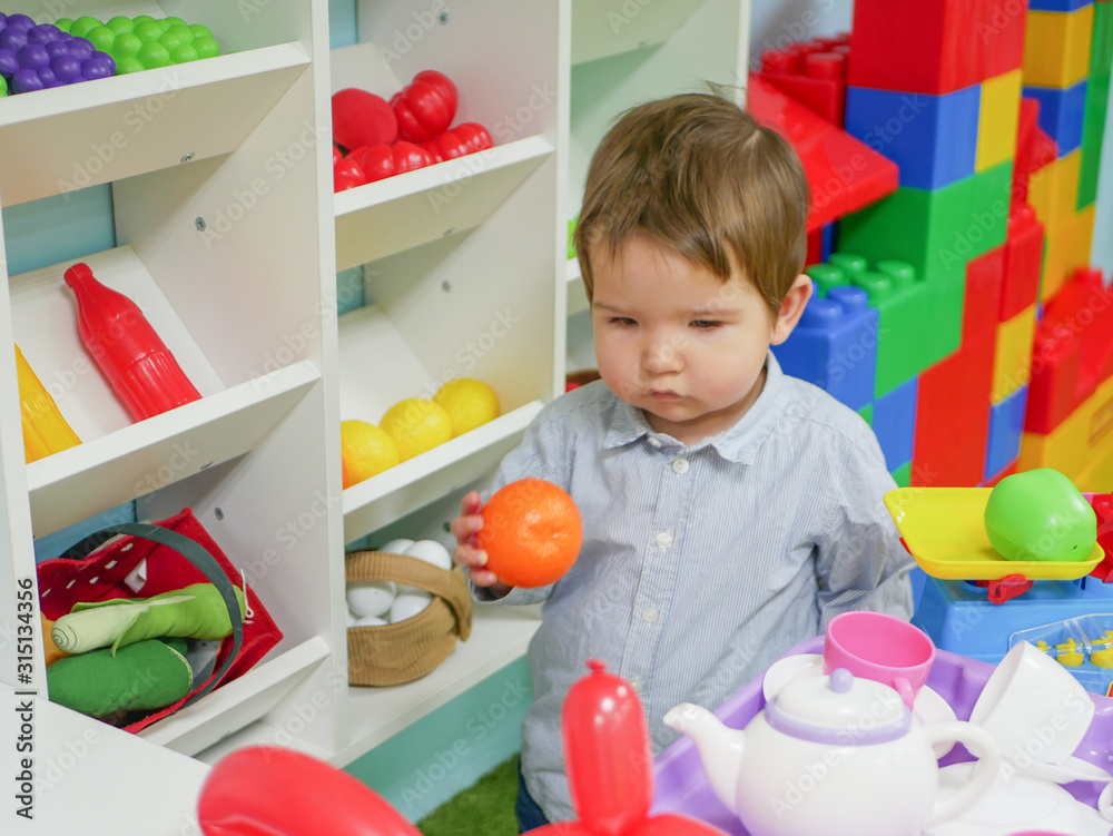A child plays with toys at home. Little child plays with toys in kindergarten.