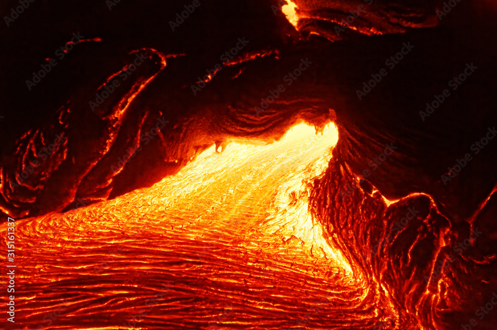 Detailed view of an active lava flow, hot magma emerges from a crack in the earth, the glowing lava appears in strong yellows and reds - Hawaii, Big Island, Kilauea volcano, Kalapana