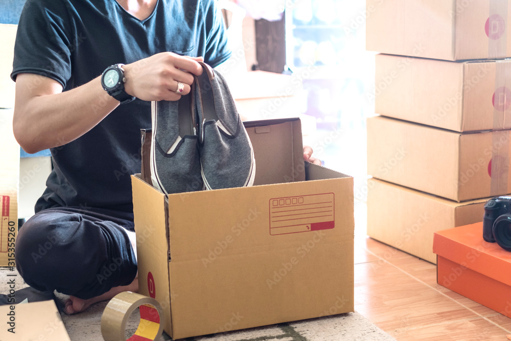 Thai young male online seller and start up small business owner putting shoes into a box and packing parcels for delivery at home.