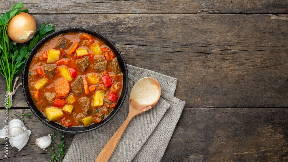 Goulash, beef stew or bogrash soup with meat, vegetables and spices in cast iron pan on wooden table. Hungarian cuisine. Rustic style. Top view.