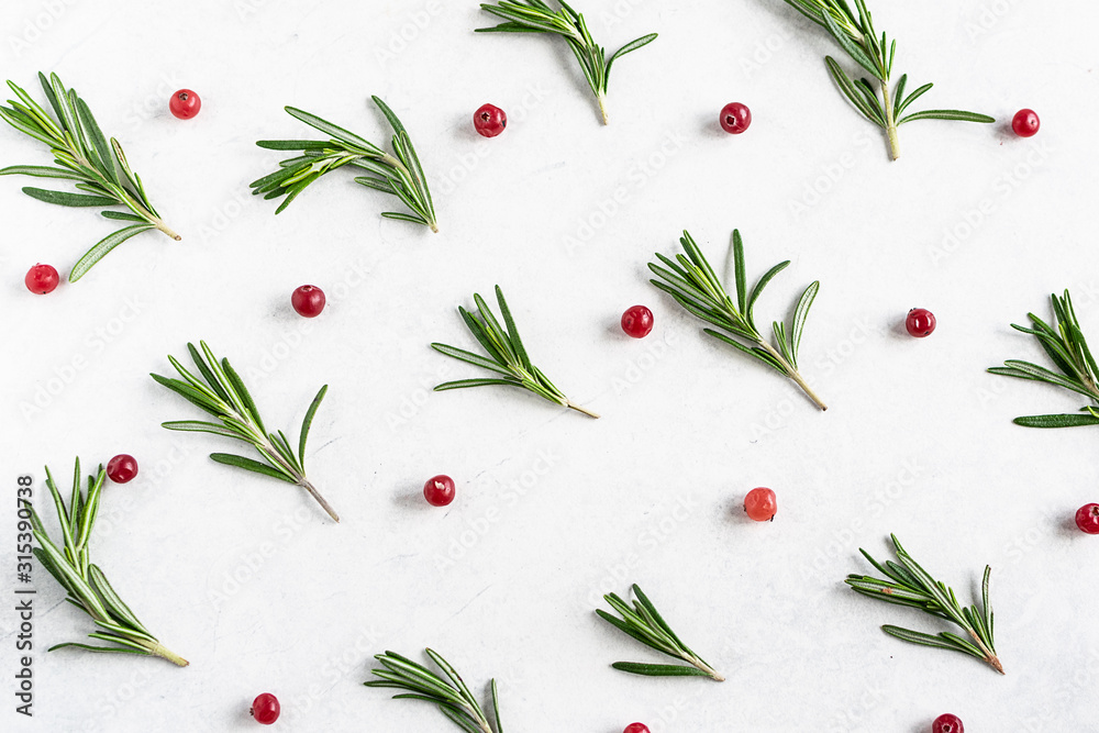 Pattern of fresh aromatic rosemary twigs and cranberries on white marble background. Flat lay overhead composition.