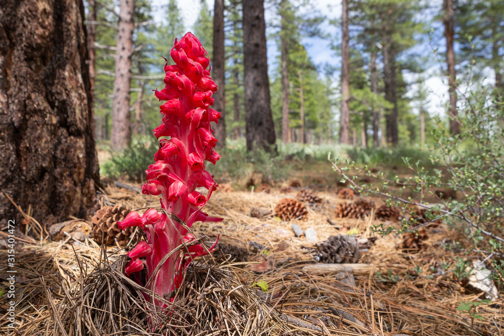 Bright red snow plant growing on forest floor in ponderosa pine forest in Sierra Nevada