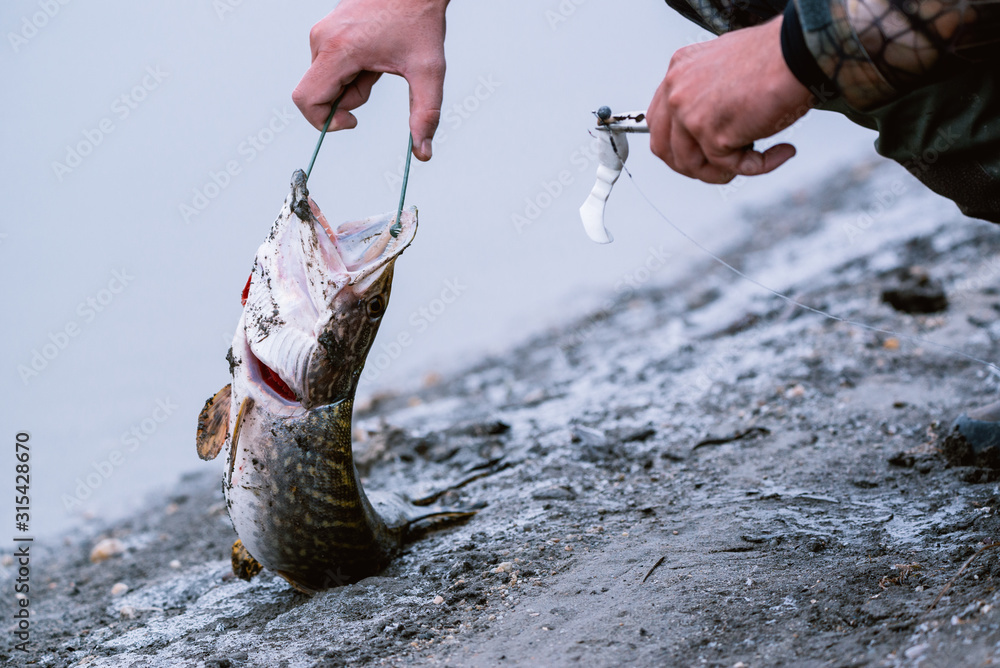 A spinning angler caught a pike, frees the bait from the mouth of the fish