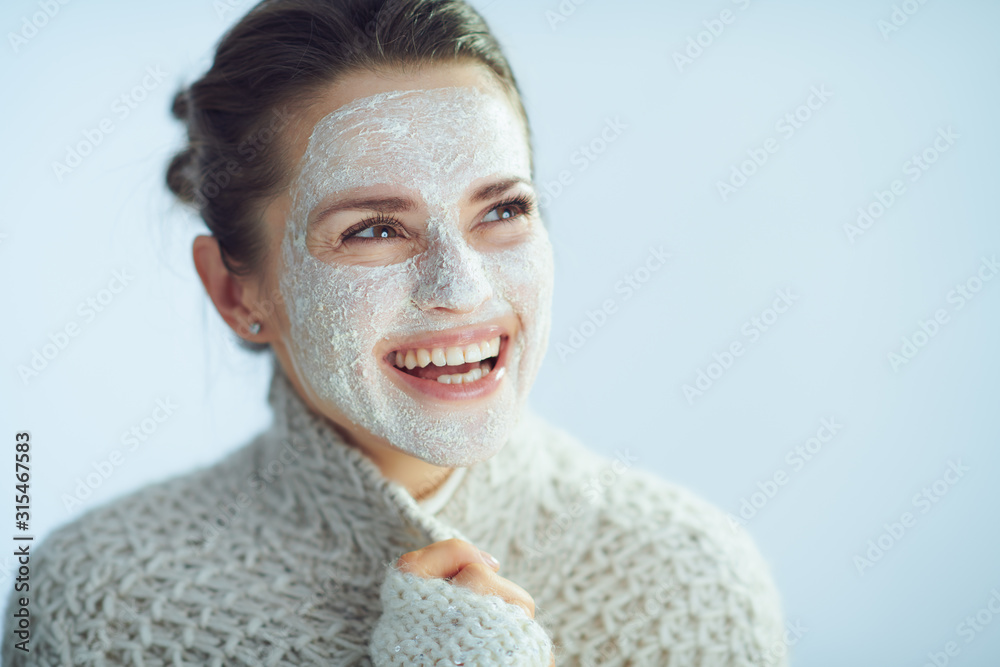 happy modern woman with white facial mask looking at copy space