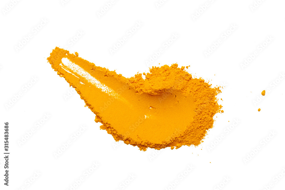 Dry turmeric powder isolated on white background.Close-up of powder orange color turmeric.top view