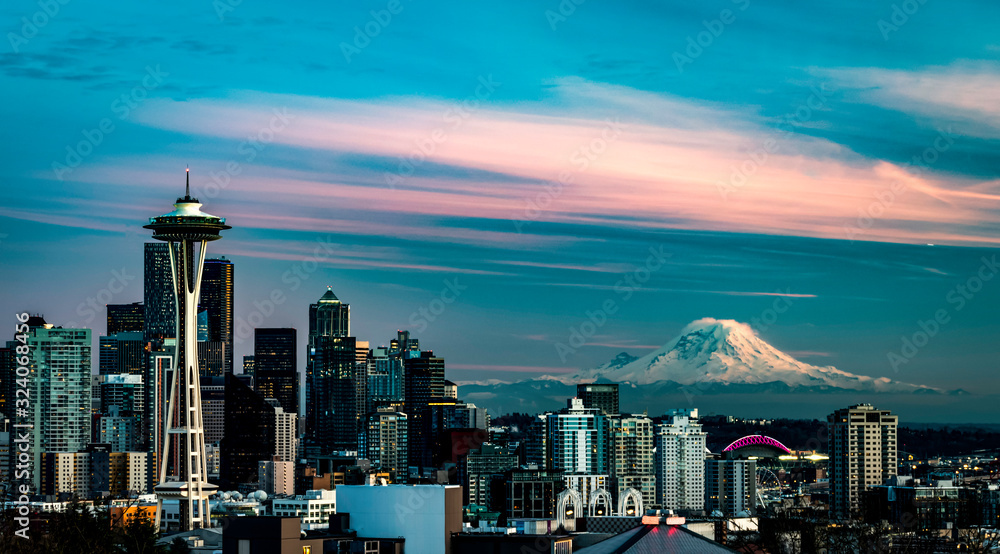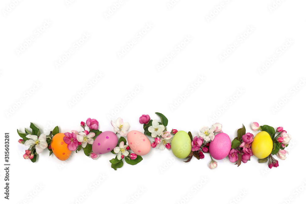 Easter decoration. Pink flowers apple tree and colored easter eggs on white background with space for text. Top view, flat lay