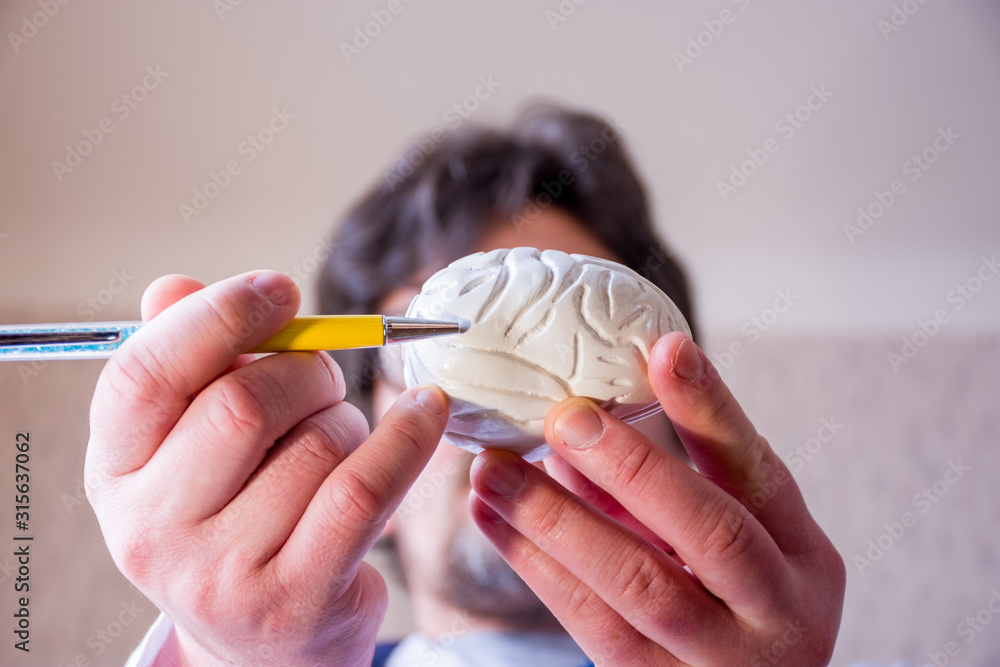 Doctor on defocused background holds in his hand anatomic model of human brain, pointing with pen in hand on brain in foreground. Localizing pathology, illness or problems with this neurological organ