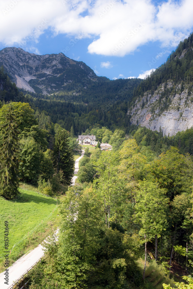 Hallstatt, Austria. Famous mountain village in the Austrian Alps on a warm autumn day. View of the mountains, forest, Austrian buildings and funicular.