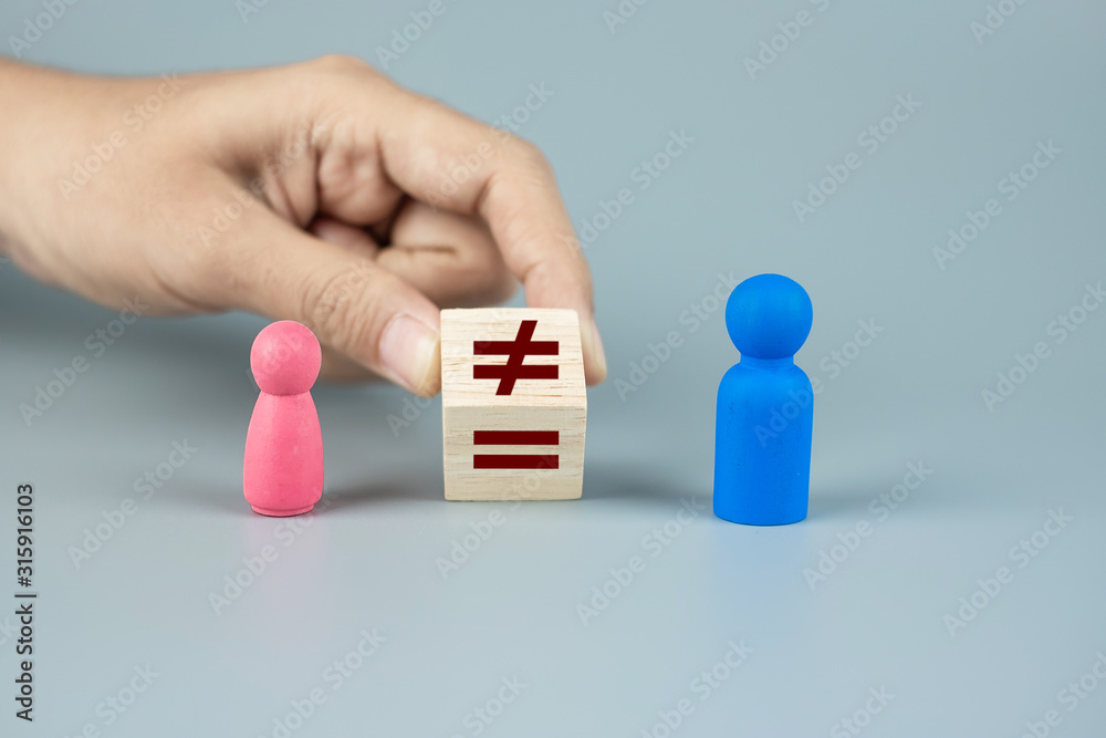 Hand change cube block of unequal to a equal sign between Pink Women and Blue Men wooden symbol. gender equality concept