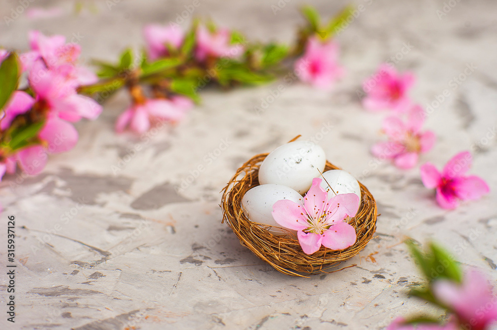 Spring conceptual photo with flowers. Flat lay blooming tree, easter eggs. The tree blooms pink and the eggs in the nest and copy space.