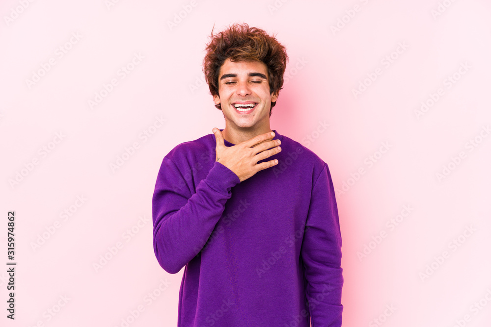 Young caucasian man against a pink background isolated laughs out loudly keeping hand on chest.