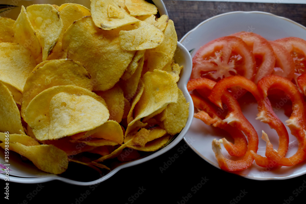 Chips in a vase and vegetables on a plate.