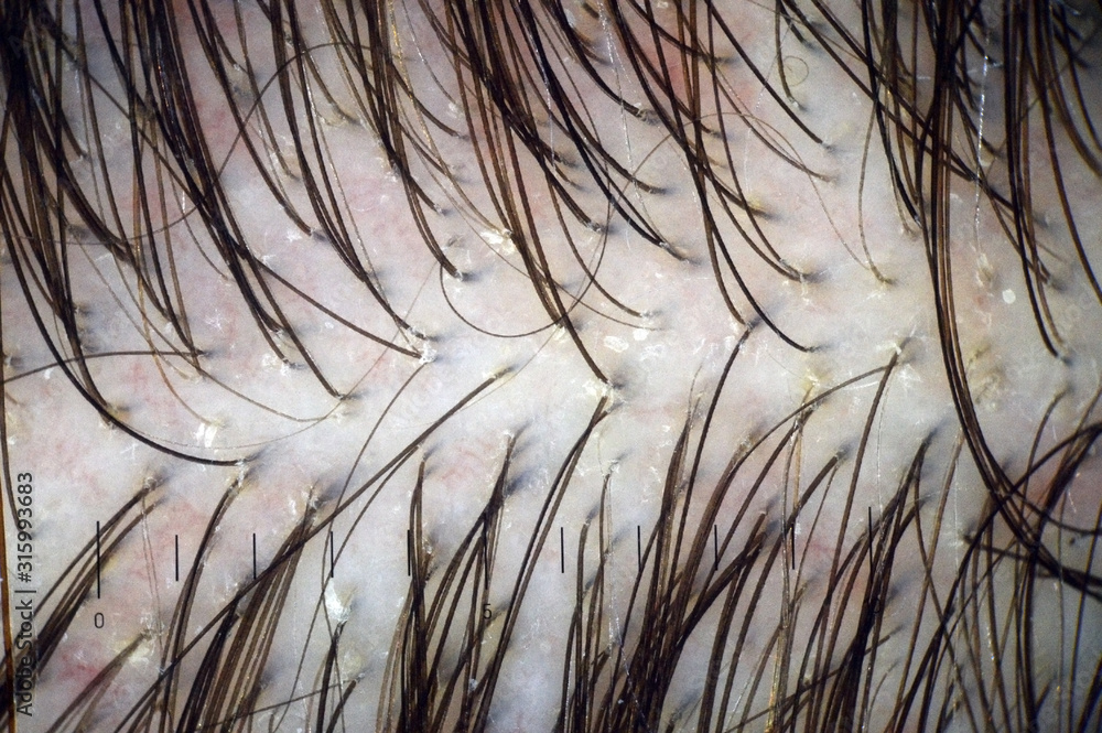 Scalp and hair with multiple exfoliation. Macroscopy of hair on the head with signs of peeling at hair follicles. Scalp dermoscopy. Hair treatment in the clinic.