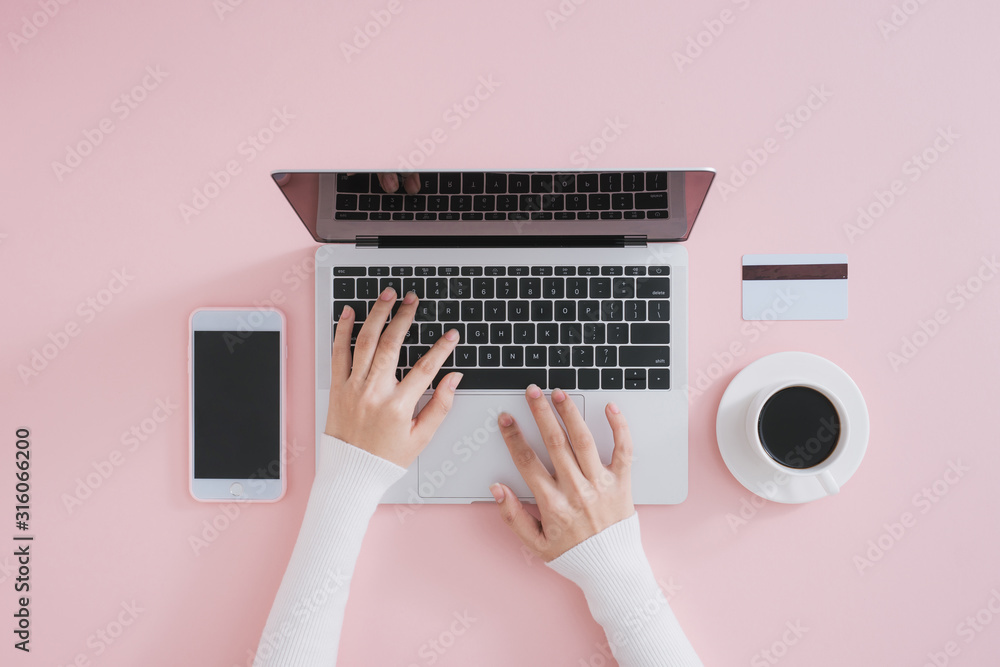 Human using laptop top view on minimal workspace. Color background and copy space.