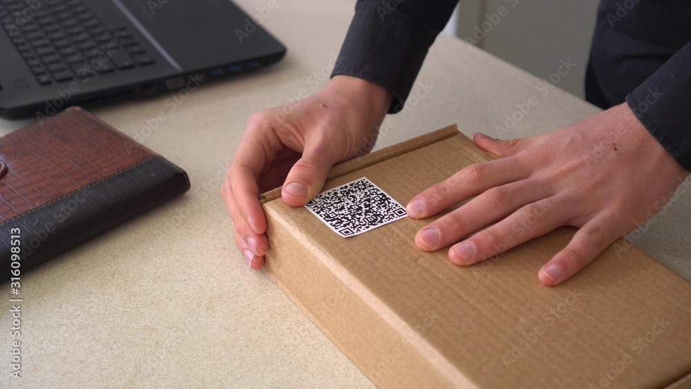 QR code technology. Small business. A Man pastes a Qr code on the package box. Delivery service. Online shop