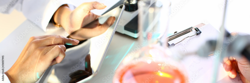 Male chemist holds test tube of glass in his hand overflows liquid solution potassium permanganate conducts analysis reaction takes various versions of reagents using chemical manufacturing water.
