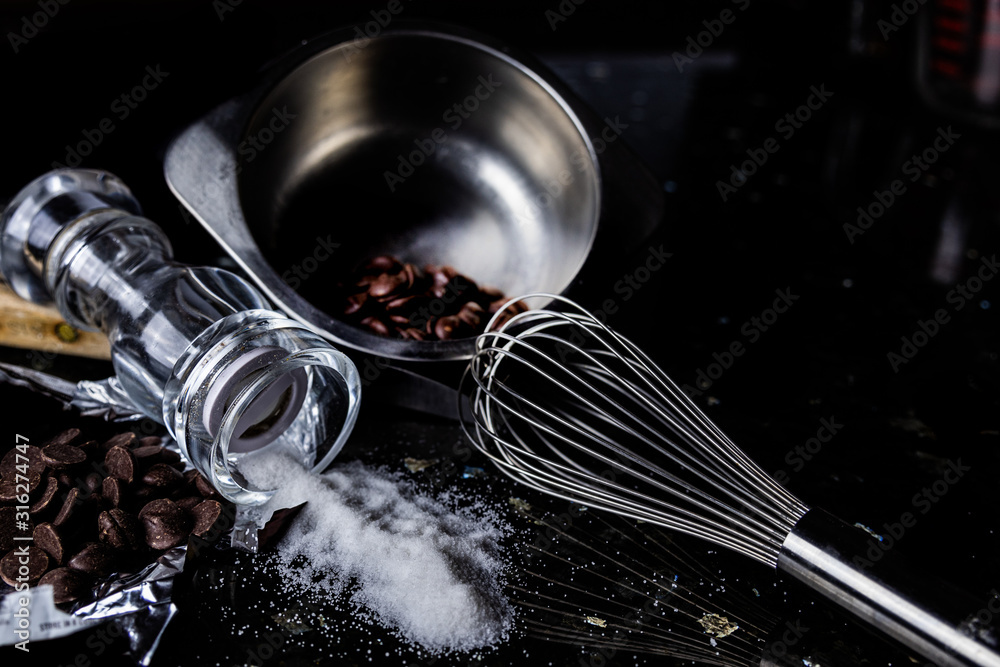 Salted dark chocolate ingredients. Chocolate bits on a wooden spoon being added to salt that has spilled out of the salt shaker. Health. Food trend. Salty and sweet.