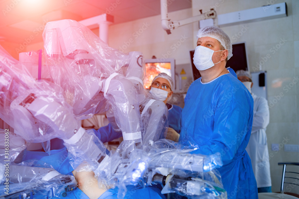 Medical robot. Robotic Surgery. Medical operation involving robot. Robotic Surgery with the da Vinci Surgical System.