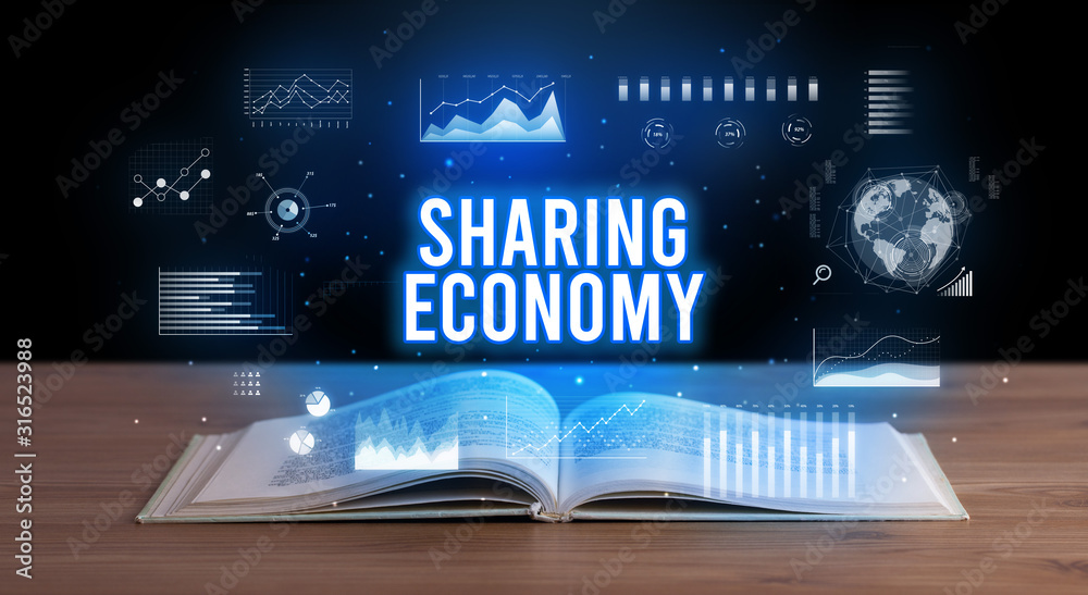 SHARING ECONOMY inscription coming out from an open book, creative business concept