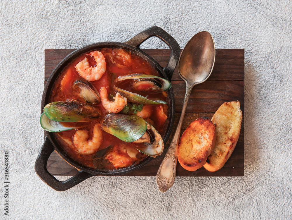 Bouillabaisse French fish soup with seafood, salmon fillet, shrimp, rich taste. traditional French cuisine. The view from the top.