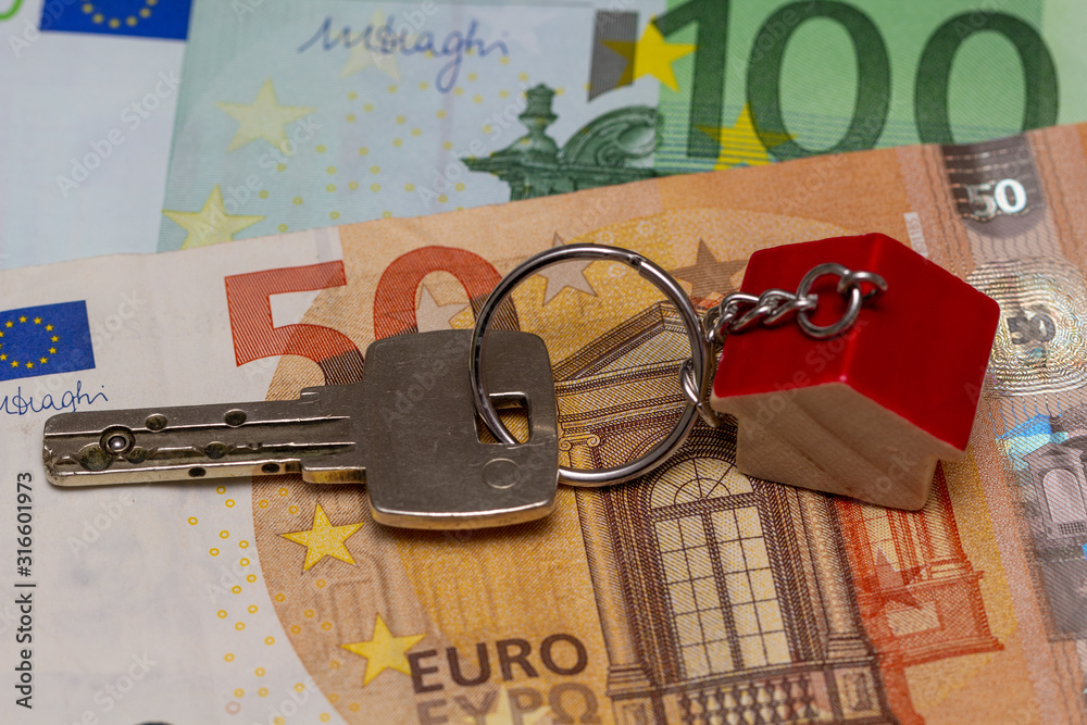 Schlüssel mit Haus Anhänger liegt auf Euro Geldscheinen