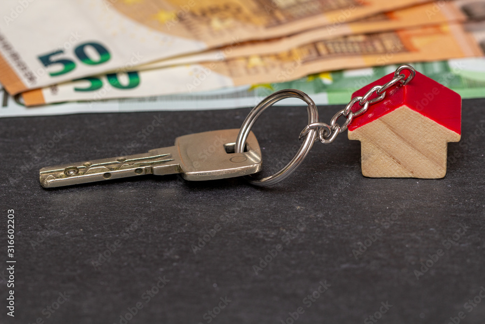 Schlüsselbund mit Geldscheinen auf Schiefertafel