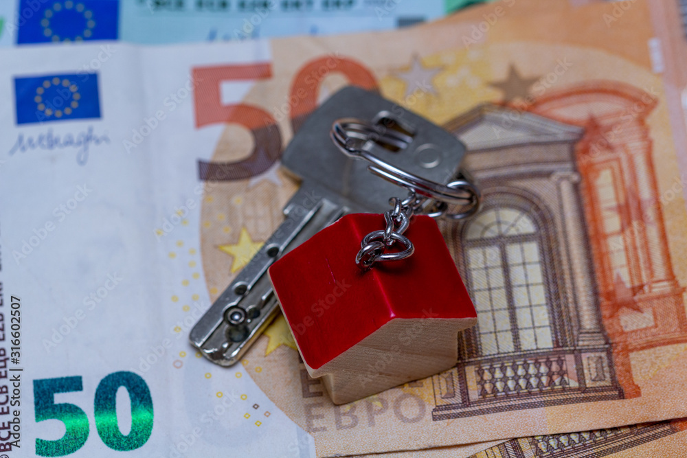 Schlüsselbund mit Schlüsselanhänger liegt auf Geldscheinen