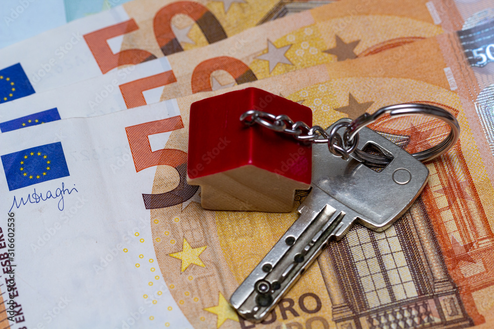 Schlüsselbund mit Schlüsselanhänger liegt auf Geldscheinen