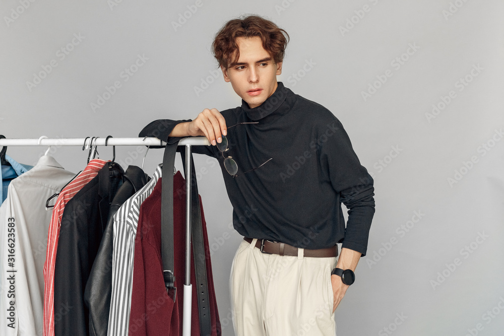 Freestyle. Man holding glasses standing isolated on gray leaning on rack with clothes pensive