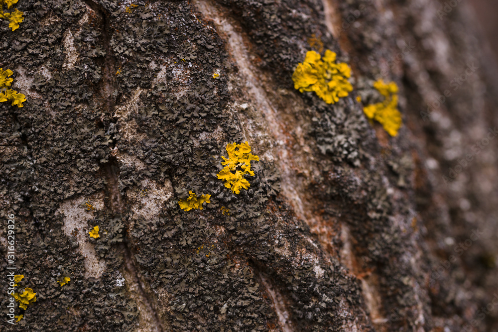 Green moss on walnut bark closeup. Stock photo of walnut tree bark and forest green moss.