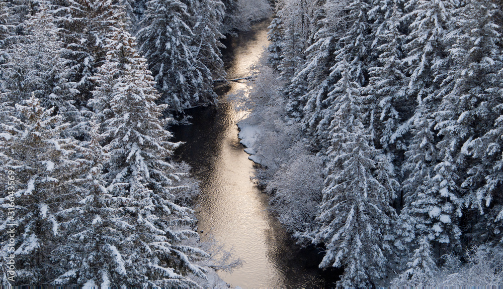 Above river through forest in winter with snow