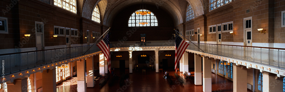 This is the interior of the Great Hall at Ellis Island which signifies immigration to the United States. There are two American flags flying posted at the center of the walls.