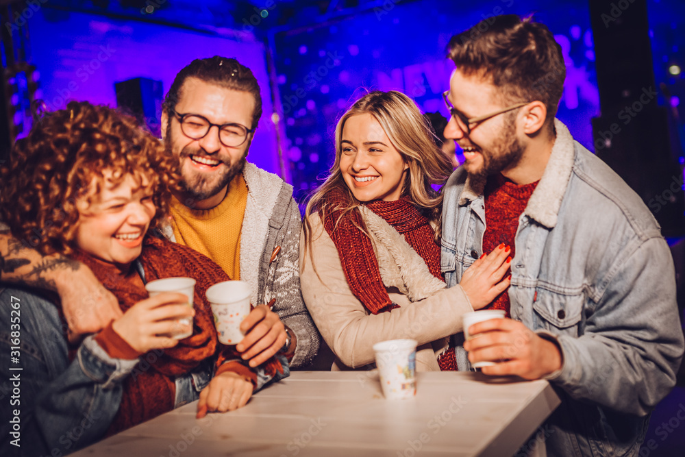 Friends drinking hot wine and having fun on outdoor concert. Celebrating new year
