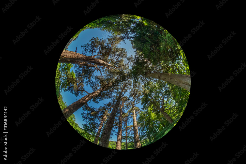 Looking Up to a Blue Sky Through an Evergreen Canopy Through a Fish Eye Lens