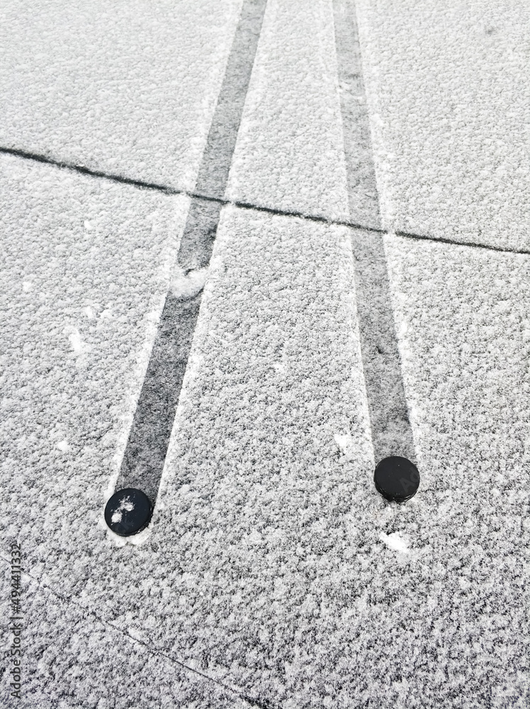 Hockey puck on a frozen pond. Ice skating in nature at sunset in winter. Travel and sports