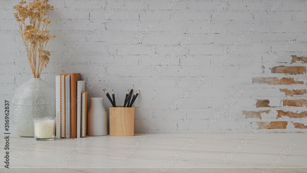 Cropped shot of contemporary workspace with copy space, decorations, pencils and books on marble desk