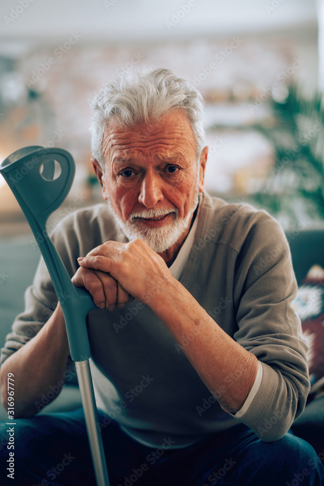 Old man with crutches. Senior man having pain.
