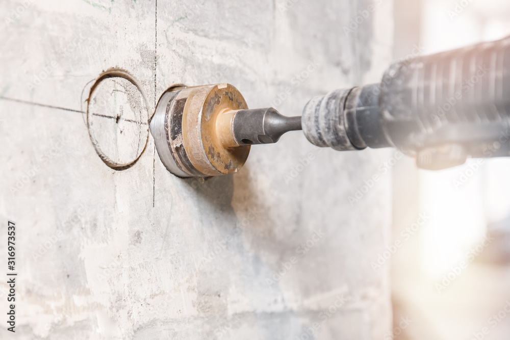 Builder man with pneumatic hammer drill perforator with diamond crown making hole in wall for electric cable, socket, switch