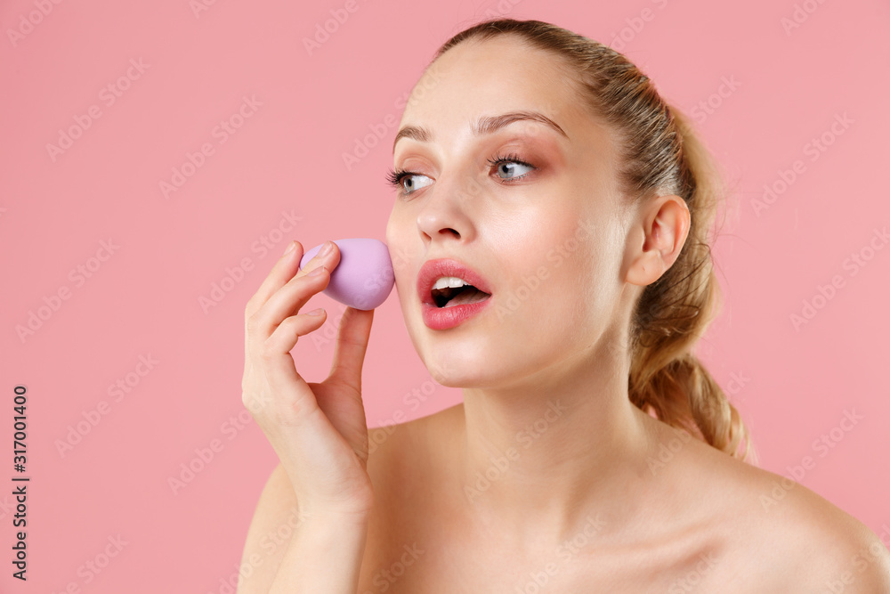 Close up blonde half naked woman 20s perfect skin blue eyes isolated on pastel pink wall background studio portrait. Skin care healthcare procedures concept Apply foundation nude makeup sponge on face