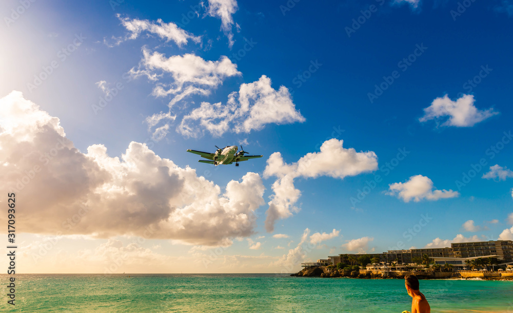 Landing of an airplane at Princess Juliana Airport from Maho Beach on the island of Saint Martin in the Caribbean