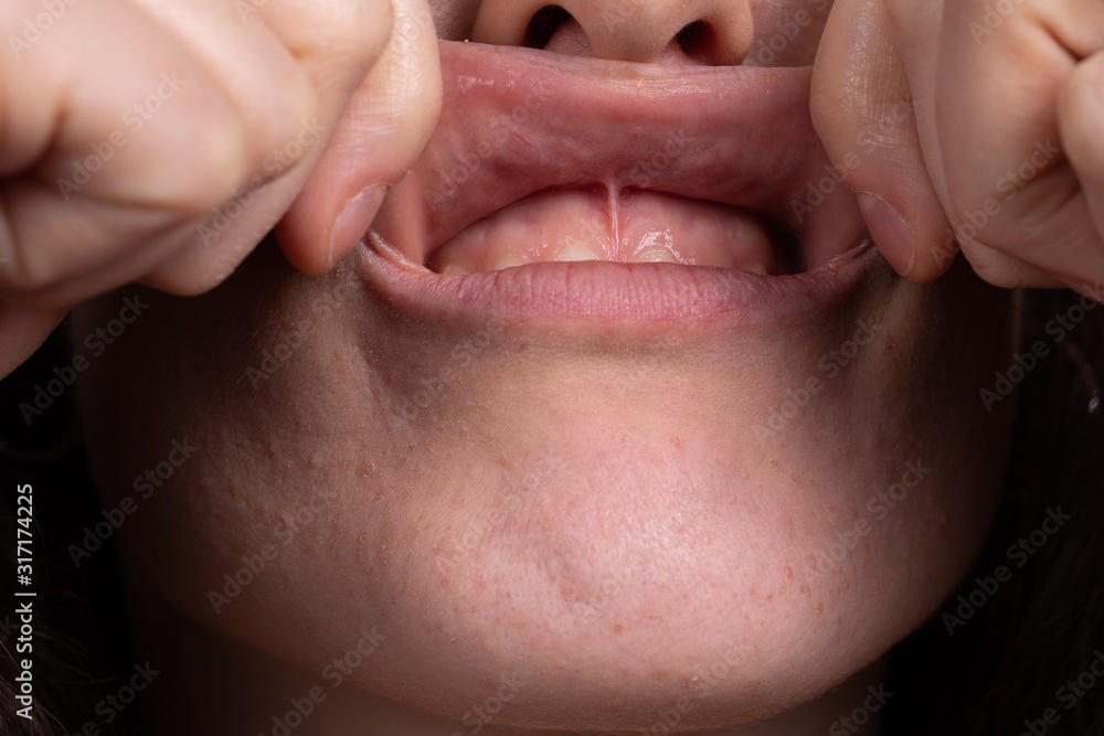 Detail of female mouth with upper lip pulled upwards with fingers