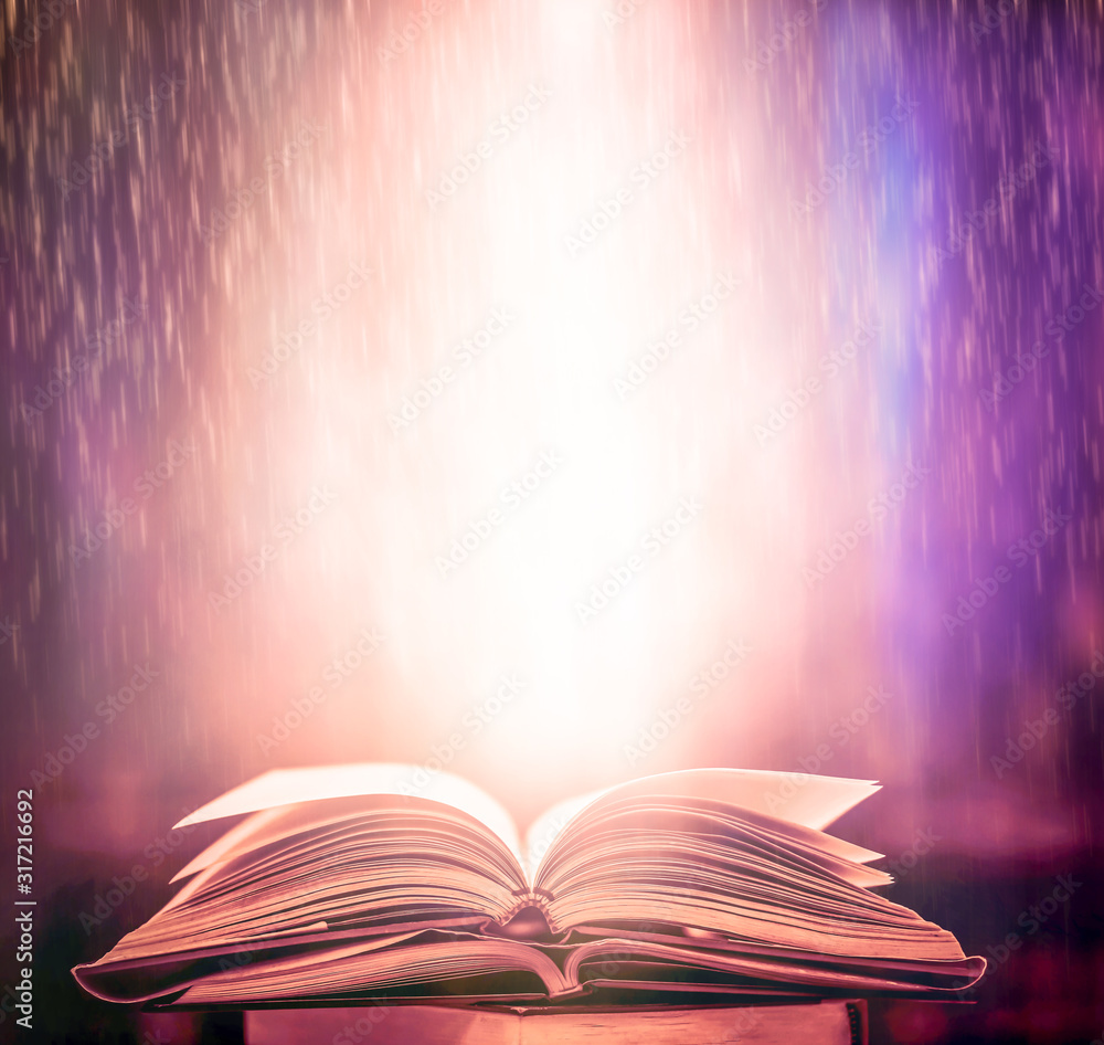 The blurred book that is bewitched with magic, the magic light in the dark, with the bright light shining down as the power to search for knowledge. For research and use as a blurred background