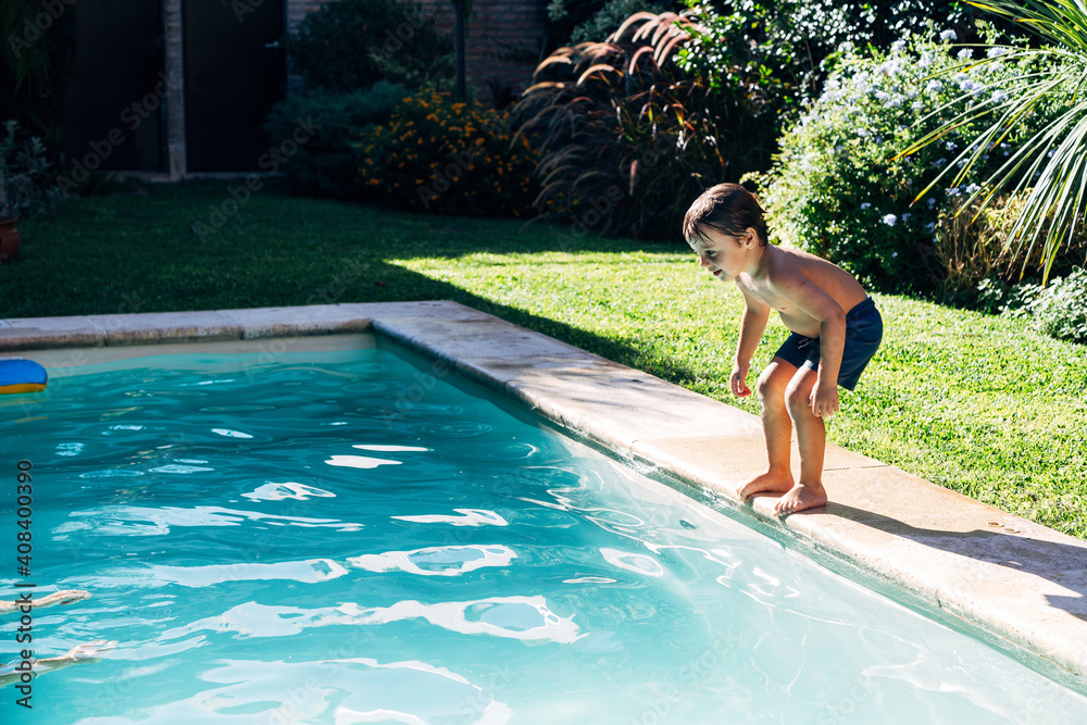 Banner with two cans of blue and red paint with brush on red background. Top view, minimal styled.