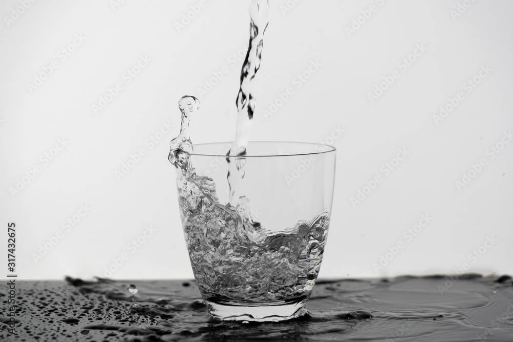 Motion blur of pouring pure drinking water flow into the glass making splash of clearly bubble