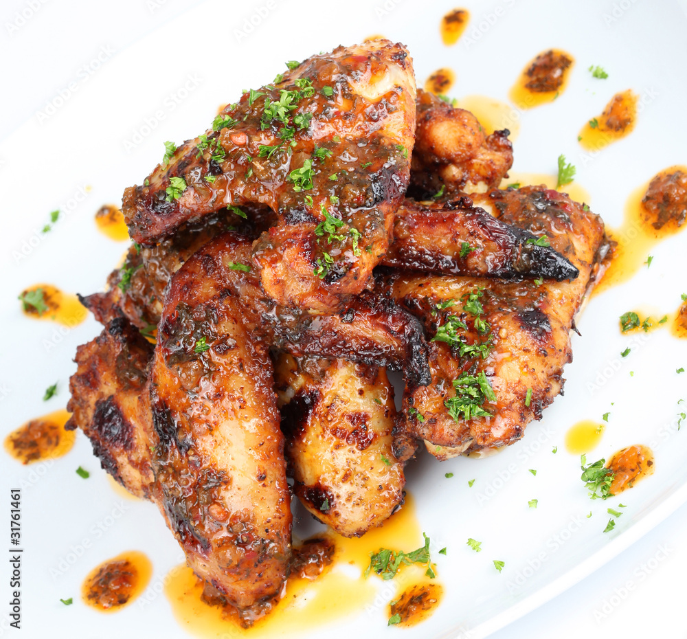 Hot grilled chicken wings on white plate with drizzle of sauce